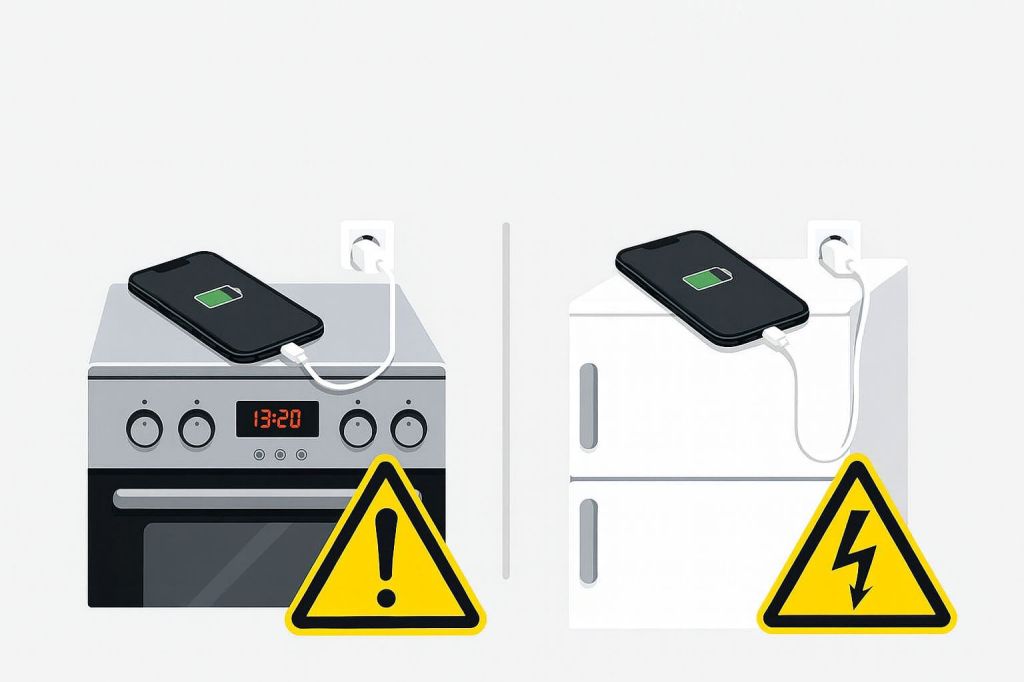 Mete telefòn ou chaje sou frijidè oswa toupre fou elektrik ka lakoz domaj. Chalè ki soti nan fou a ka afekte batri a, pandan ke vibrasyon oswa frekans elektrik frijidè a ka entèfere ak chajman an. Sa ka fè chaj la pi ralanti, pa konplè, oswa menm bay pwoblèm teknik sou telefòn nan.